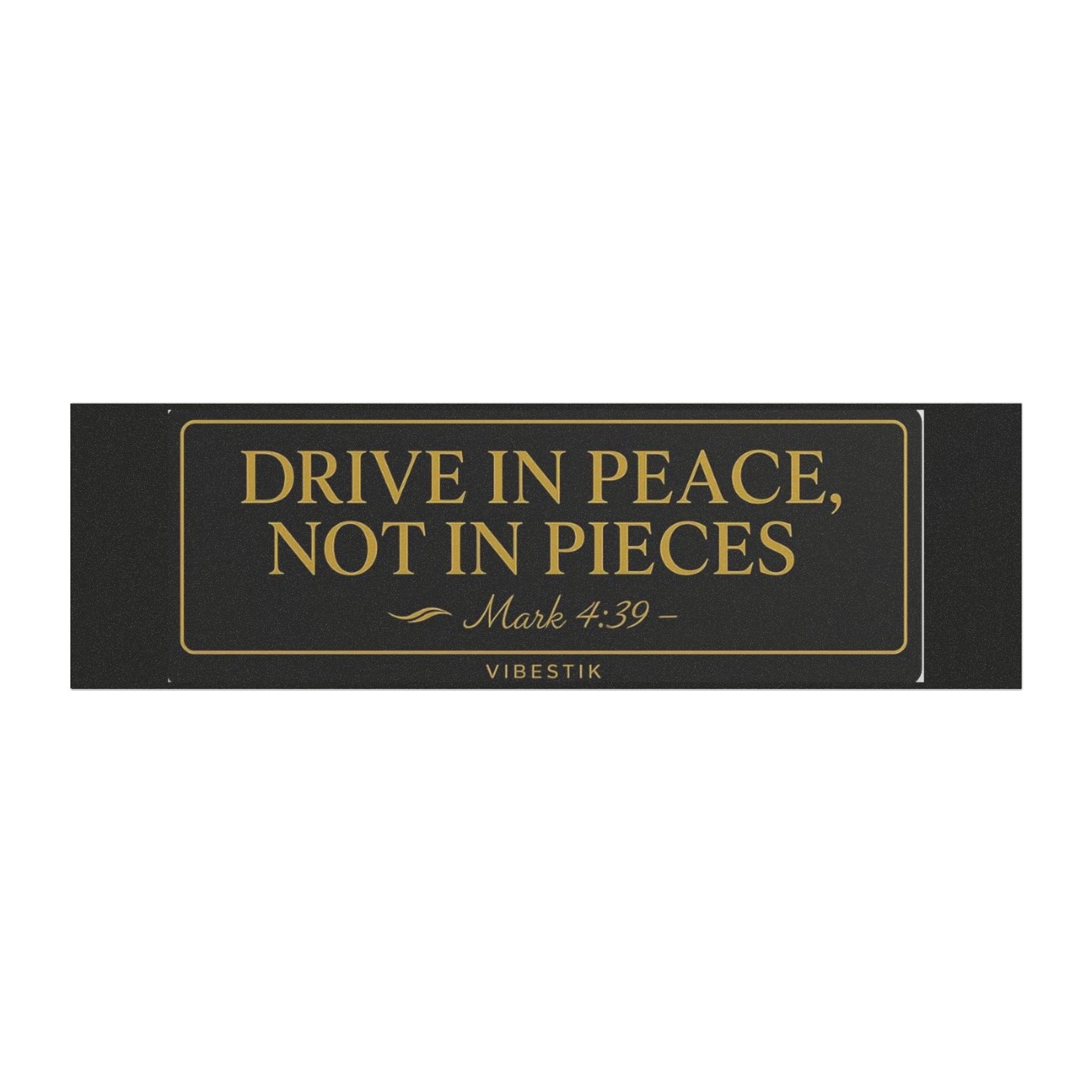 Drive in Peace, Not in Pieces — Mark 4:39” Rendered in elegant gold on matte black, with a thin gold border and a subtle wave motif near the verse. It’s centered, aspirational, and ready to turn heads while calming hearts.